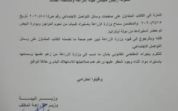 وأشار الكتاب انه بالرجوع الى قيود وزارة الزراعة تبين عدم صحة ما تضمنه الكتاب المتداول على مواقع التواصل الاجتماعي.